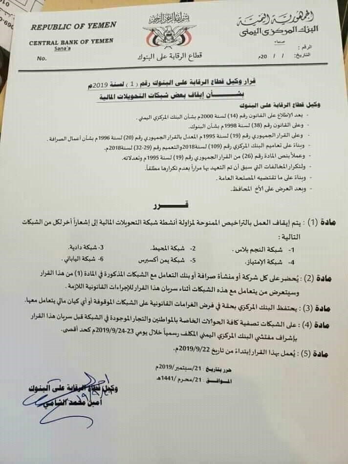 ووفقا لوثيقة البنك المركزي في صنعاء، يتم إيقاق العمل بالترخيص الممنوحة لمزاولة أنشطة شبكة التحويلات المالية لشبكات: "النجم، والمحيط، ودادية، والإمتياز، يمن اكسبريس، شبكة الياباني".